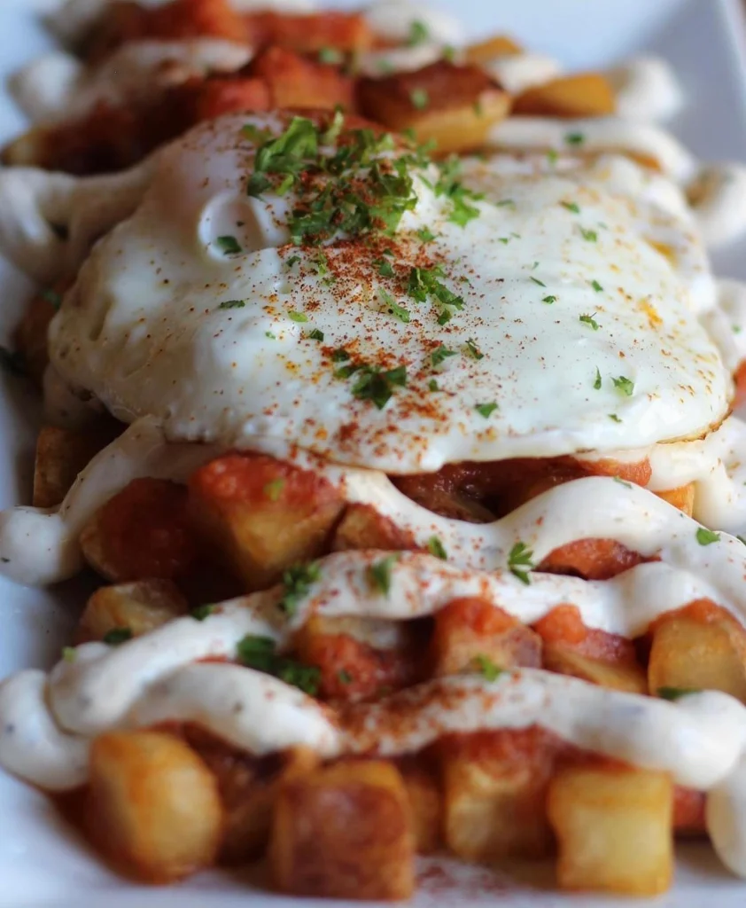 Crispy golden potatoes topped with a bold, spicy brava sauce and a creamy garlic aioli sauce.