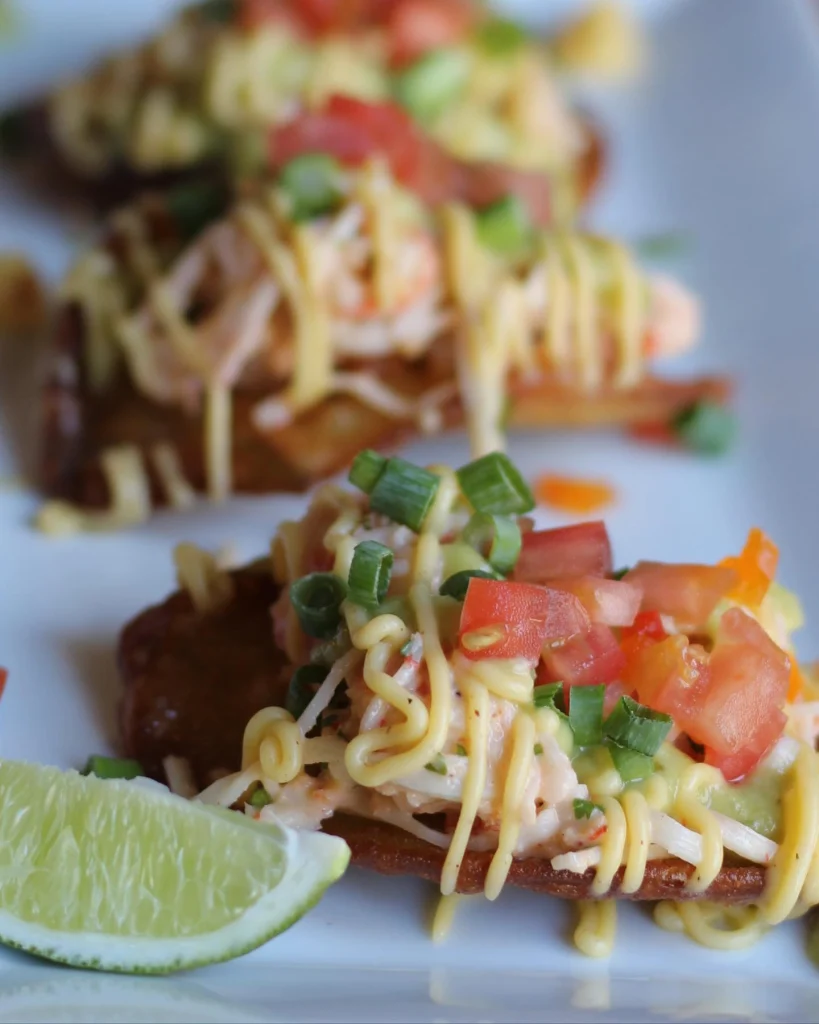 Bacalaítos montados con langosta y “King crab” con aderezo cremoso de chipotle, tomate, cebollín verde y salsa holandesa con aguacate.